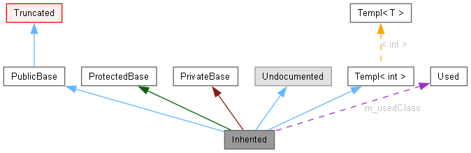 • A purple dashed arrow is used if a class is contained or used by another class. The arrow is labeled with the variable(s) through which the pointed class or struct is accessible.